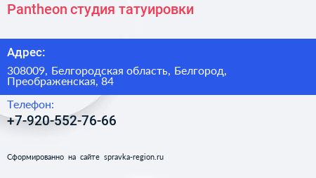 Pantheon, студия татуировки по адресу 308009, Белгородская область, Белгород, Преображенская, 84 в дальнейшем Организация, размещена в следующих категориях: