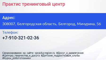 Практис, тренинговый центр по адресу 308007, Белгородская область, Белгород, Мичурина, 56 в дальнейшем Организация, размещена в следующих категориях: