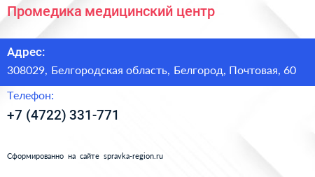 Промедика, медицинский центр по адресу 308029, Белгородская область, Белгород, Почтовая, 60 в дальнейшем Организация, размещена в следующих категориях: