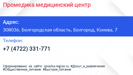 Промедика, медицинский центр по адресу 308036, Белгородская область, Белгород, Конева, 7 в дальнейшем Организация, размещена в следующих категориях: