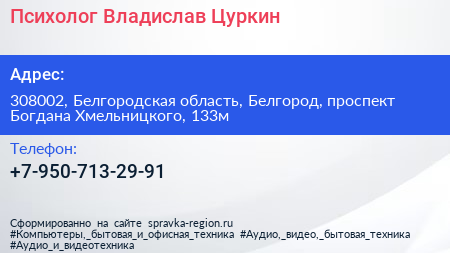 Психолог Владислав Цуркин по адресу 308002, Белгородская область, Белгород, проспект Богдана Хмельницкого, 133м в дальнейшем Организация, размещена в следующих категориях: