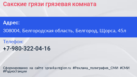 Сакские грязи, грязевая комната по адресу 308004, Белгородская область, Белгород, Щорса, 45л в дальнейшем Организация, размещена в следующих категориях: