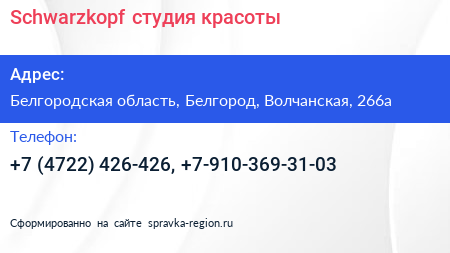 Schwarzkopf, студия красоты по адресу Белгородская область, Белгород, Волчанская, 266а в дальнейшем Организация, размещена в следующих категориях: