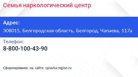 Семья, наркологический центр по адресу 308015, Белгородская область, Белгород, Чапаева, 117а в дальнейшем Организация, размещена в следующих категориях:
