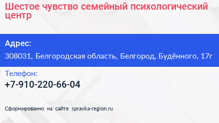 Шестое чувство, семейный психологический центр по адресу 308031, Белгородская область, Белгород, Будённого, 17г в дальнейшем Организация, размещена в следующих категориях:
