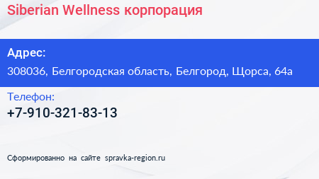 Siberian Wellness, корпорация по адресу 308036, Белгородская область, Белгород, Щорса, 64а в дальнейшем Организация, размещена в следующих категориях:
