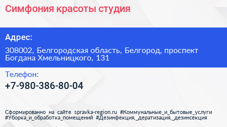 Симфония красоты, студия по адресу 308002, Белгородская область, Белгород, проспект Богдана Хмельницкого, 131 в дальнейшем Организация, размещена в следующих категориях: