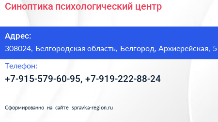 Синоптика, психологический центр по адресу 308024, Белгородская область, Белгород, Архиерейская, 5 в дальнейшем Организация, размещена в следующих категориях: