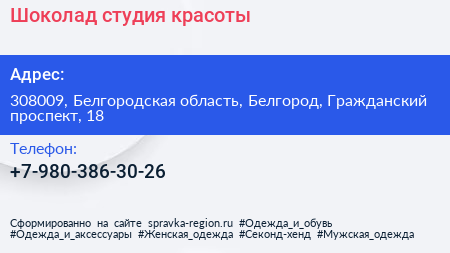 Шоколад, студия красоты по адресу 308009, Белгородская область, Белгород, Гражданский проспект, 18 в дальнейшем Организация, размещена в следующих категориях: