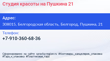 Студия красоты на Пушкина 21 по адресу 308015, Белгородская область, Белгород, Пушкина, 21 в дальнейшем Организация, размещена в следующих категориях: