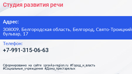 Студия развития речи по адресу 308009, Белгородская область, Белгород, Свято-Троицкий бульвар, 17 в дальнейшем Организация, размещена в следующих категориях: