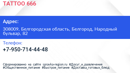 TATTOO 666 по адресу 308009, Белгородская область, Белгород, Народный бульвар, 82 в дальнейшем Организация, размещена в следующих категориях: