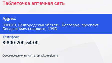 Таблеточка, аптечная сеть по адресу 308010, Белгородская область, Белгород, проспект Богдана Хмельницкого, 139Б в дальнейшем Организация, размещена в следующих категориях: