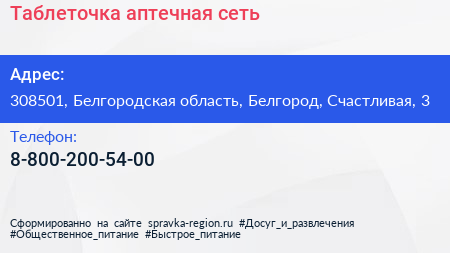 Таблеточка, аптечная сеть по адресу 308501, Белгородская область, Белгород, Счастливая, 3 в дальнейшем Организация, размещена в следующих категориях: