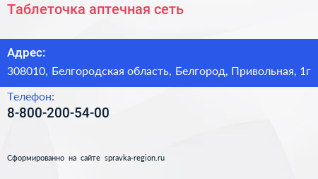 Таблеточка, аптечная сеть по адресу 308010, Белгородская область, Белгород, Привольная, 1г в дальнейшем Организация, размещена в следующих категориях: