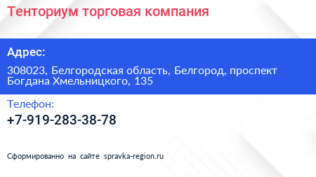 Тенториум, торговая компания по адресу 308023, Белгородская область, Белгород, проспект Богдана Хмельницкого, 135 в дальнейшем Организация, размещена в следующих категориях: