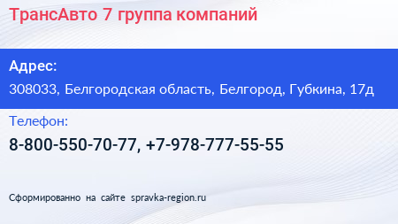 ТрансАвто-7, группа компаний по адресу 308033, Белгородская область, Белгород, Губкина, 17д в дальнейшем Организация, размещена в следующих категориях: