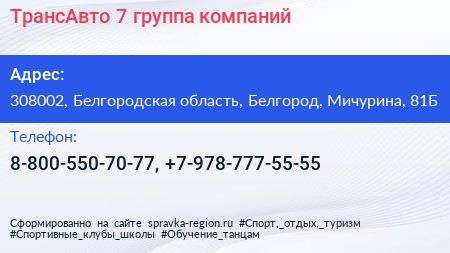 ТрансАвто-7, группа компаний по адресу 308002, Белгородская область, Белгород, Мичурина, 81Б в дальнейшем Организация, размещена в следующих категориях: