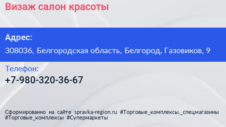 Визаж, салон красоты по адресу 308036, Белгородская область, Белгород, Газовиков, 9 в дальнейшем Организация, размещена в следующих категориях: