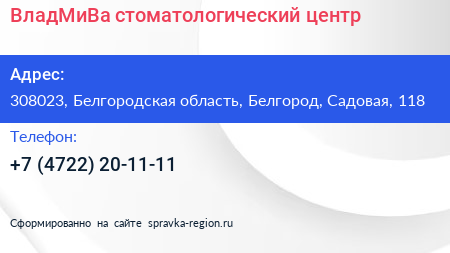 ВладМиВа, стоматологический центр по адресу 308023, Белгородская область, Белгород, Садовая, 118 в дальнейшем Организация, размещена в следующих категориях: