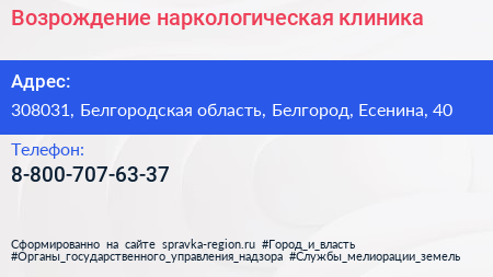 Возрождение, наркологическая клиника по адресу 308031, Белгородская область, Белгород, Есенина, 40 в дальнейшем Организация, размещена в следующих категориях: