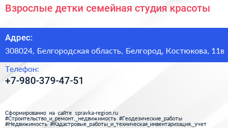 Взрослые детки, семейная студия красоты по адресу 308024, Белгородская область, Белгород, Костюкова, 11в в дальнейшем Организация, размещена в следующих категориях: