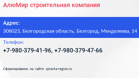 АлюМир, строительная компания по адресу 308023, Белгородская область, Белгород, Менделеева, 14 в дальнейшем Организация, размещена в следующих категориях: