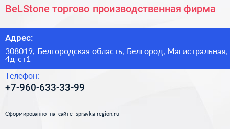 BeLStone, торгово-производственная фирма по адресу 308019, Белгородская область, Белгород, Магистральная, 4д ст1 в дальнейшем Организация, размещена в следующих категориях: