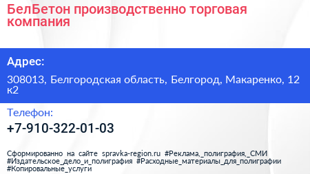 БелБетон, производственно-торговая компания по адресу 308013, Белгородская область, Белгород, Макаренко, 12 к2 в дальнейшем Организация, размещена в следующих категориях: