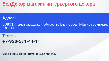 БелДекор, магазин интерьерного декора по адресу 308019, Белгородская область, Белгород, Магистральная, 4д ст1 в дальнейшем Организация, размещена в следующих категориях: