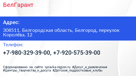 БелГарант по адресу 308511, Белгородская область, Белгород, переулок Королёва, 12 в дальнейшем Организация, размещена в следующих категориях: