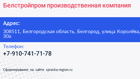 Белстройпром, производственная компания по адресу 308511, Белгородская область, Белгород, улица Королёва, 30а в дальнейшем Организация, размещена в следующих категориях: