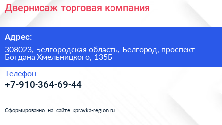 Двернисаж, торговая компания по адресу 308023, Белгородская область, Белгород, проспект Богдана Хмельницкого, 135Б в дальнейшем Организация, размещена в следующих категориях:
