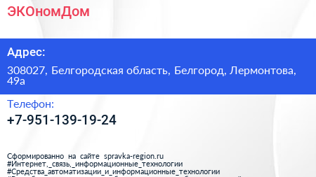 ЭКОномДом по адресу 308027, Белгородская область, Белгород, Лермонтова, 49а в дальнейшем Организация, размещена в следующих категориях: