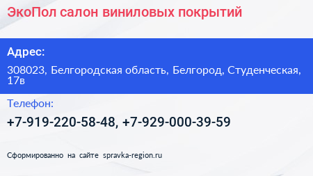 ЭкоПол, салон виниловых покрытий по адресу 308023, Белгородская область, Белгород, Студенческая, 17в в дальнейшем Организация, размещена в следующих категориях: