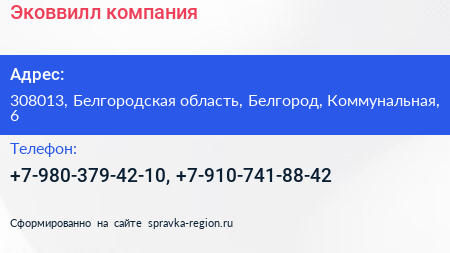 Эковвилл, компания по адресу 308013, Белгородская область, Белгород, Коммунальная, 6 в дальнейшем Организация, размещена в следующих категориях: