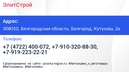 ЭлитСтрой по адресу 308010, Белгородская область, Белгород, Кутузова, 2а в дальнейшем Организация, размещена в следующих категориях: