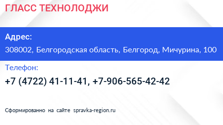 ГЛАСС ТЕХНОЛОДЖИ по адресу 308002, Белгородская область, Белгород, Мичурина, 100 в дальнейшем Организация, размещена в следующих категориях: