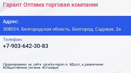 Гарант Оптима, торговая компания по адресу 308014, Белгородская область, Белгород, Садовая, 2а в дальнейшем Организация, размещена в следующих категориях:
