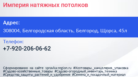 Империя натяжных потолков по адресу 308004, Белгородская область, Белгород, Щорса, 45л в дальнейшем Организация, размещена в следующих категориях: