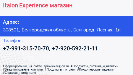 Italon Experience, магазин по адресу 308501, Белгородская область, Белгород, Лесная, 1и в дальнейшем Организация, размещена в следующих категориях: