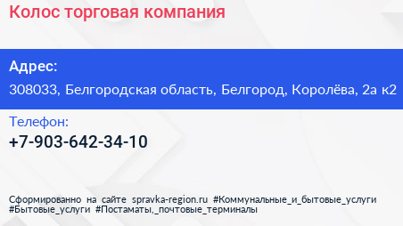 Колос, торговая компания по адресу 308033, Белгородская область, Белгород, Королёва, 2а к2 в дальнейшем Организация, размещена в следующих категориях: