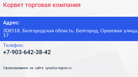Корвет, торговая компания по адресу 308518, Белгородская область, Белгород, Ореховая улица, 17 в дальнейшем Организация, размещена в следующих категориях: