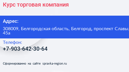 Курс, торговая компания по адресу 308009, Белгородская область, Белгород, проспект Славы, 45а в дальнейшем Организация, размещена в следующих категориях: