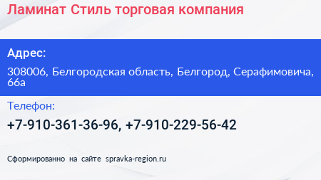 Ламинат Стиль, торговая компания по адресу 308006, Белгородская область, Белгород, Серафимовича, 66а в дальнейшем Организация, размещена в следующих категориях: