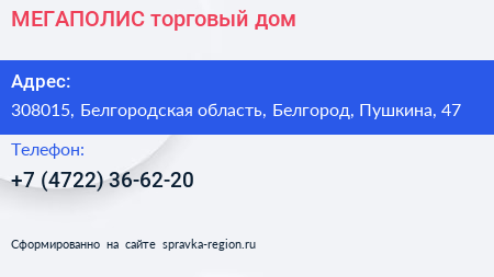 МЕГАПОЛИС, торговый дом по адресу 308015, Белгородская область, Белгород, Пушкина, 47 в дальнейшем Организация, размещена в следующих категориях: