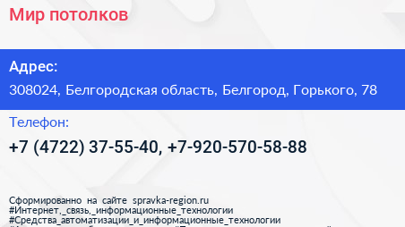Мир потолков по адресу 308024, Белгородская область, Белгород, Горького, 78 в дальнейшем Организация, размещена в следующих категориях: