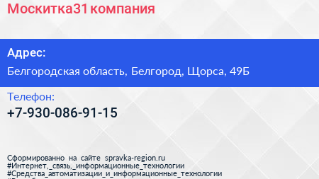 Москитка31, компания по адресу Белгородская область, Белгород, Щорса, 49Б в дальнейшем Организация, размещена в следующих категориях: