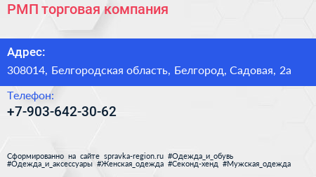 РМП, торговая компания по адресу 308014, Белгородская область, Белгород, Садовая, 2а в дальнейшем Организация, размещена в следующих категориях: