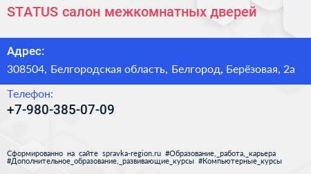 STATUS, салон межкомнатных дверей по адресу 308504, Белгородская область, Белгород, Берёзовая, 2а в дальнейшем Организация, размещена в следующих категориях: